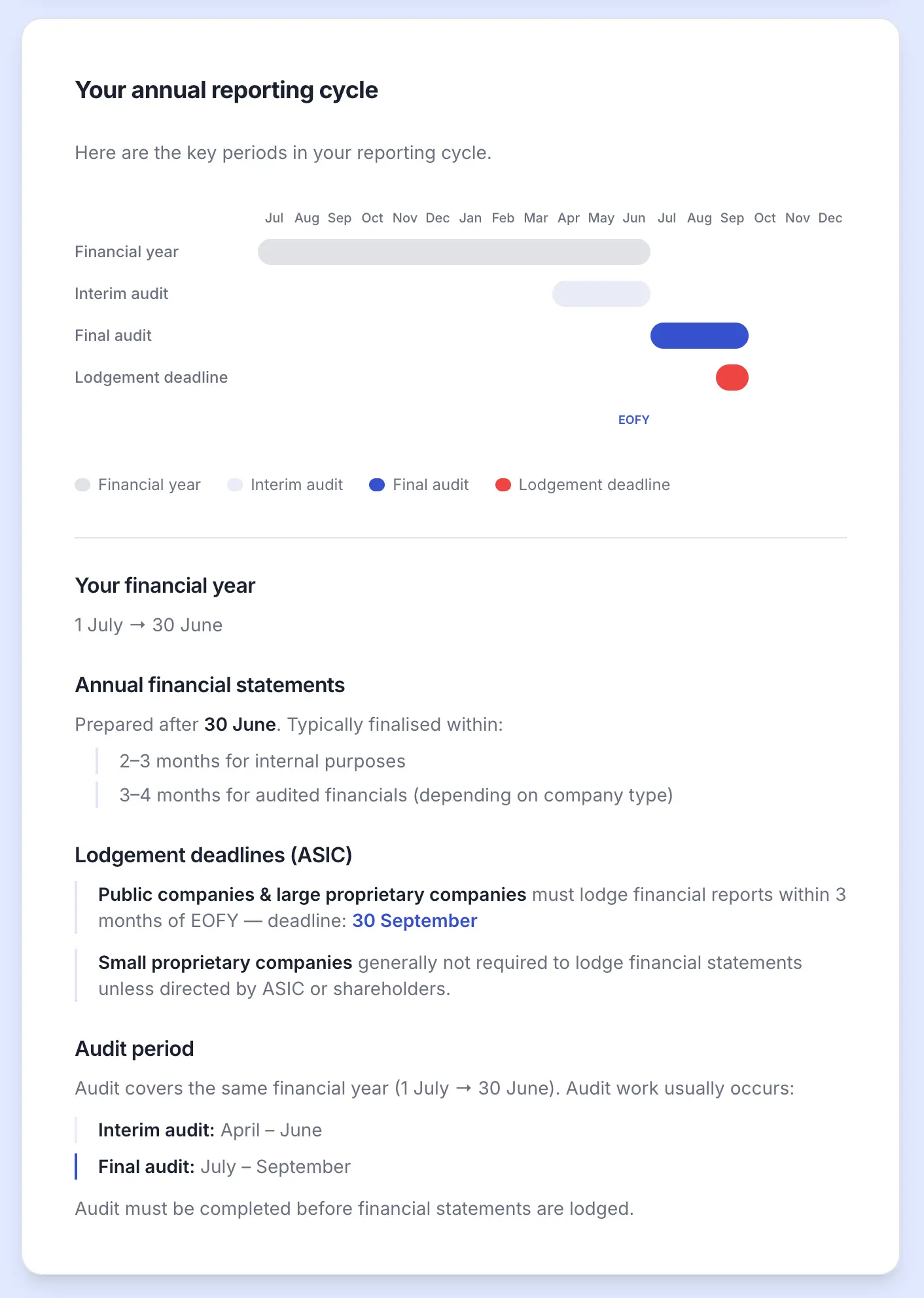 Key milestones including audit periods, financial reporting, and lodgement deadlines
